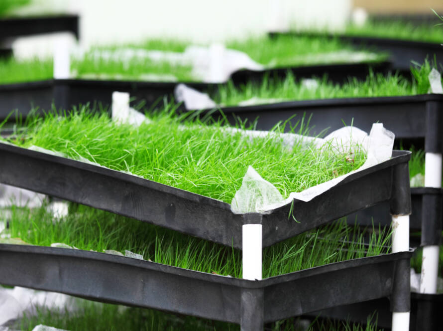 Hydroponic forage is grown without soil in a controlled environment, producing fresh, mold-free feed rich in vitamins and enzymes.